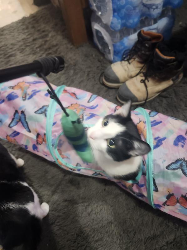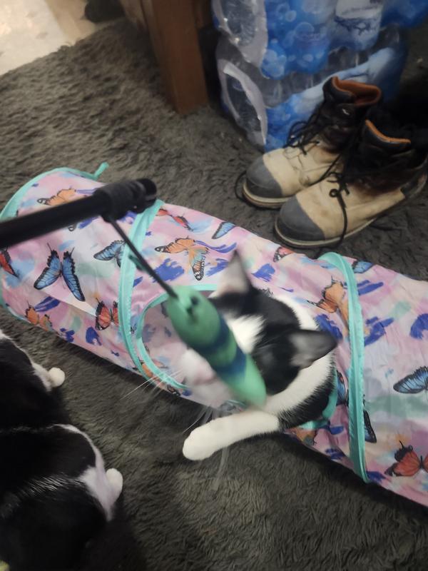 It’s a HIT! Our cats LOVED the tunnel! One loves to sleep in it and the other loves to play – hard! He loves the wand with a toy attached and we have spent a lot