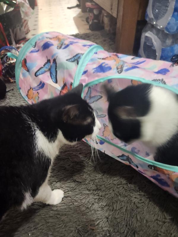 The butterfly tunnel is a hit with both of my cats. The toys they like to play with are the crinkle ball, the sisal wrapped ball, the velour ball with knubs, and