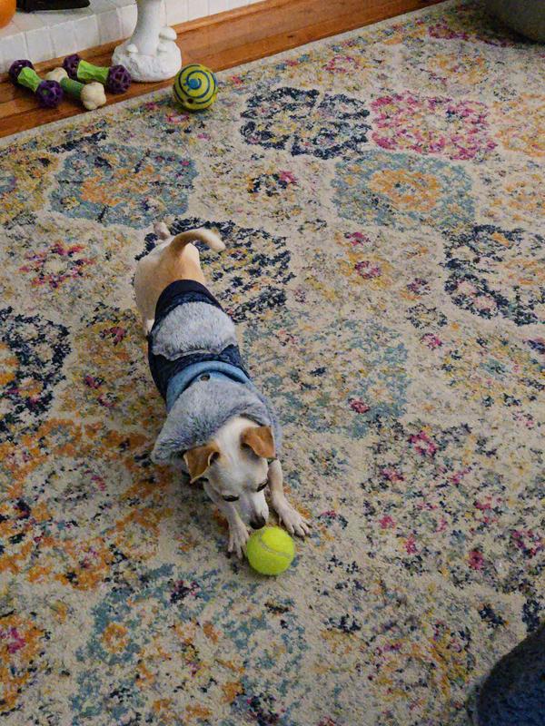 I bought this hoodie for our rescue's foster puppies, so the pups will have something warm to wear when they leave for their new homes up north. It looks cute, but the material is not very substantial. The fuzzy sections are great, but the fuzz is on the outside, not the inside, so it won't help keep the pups warm. But the price was very good, so I purchased it anyway. Just wish the sweatshirt was a bit thicker for insulation.