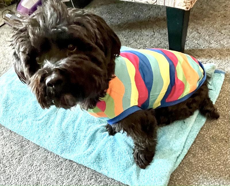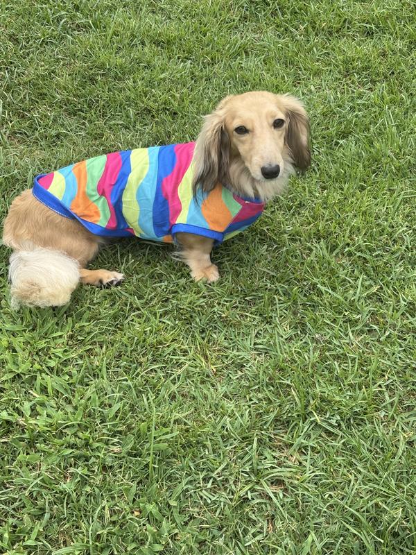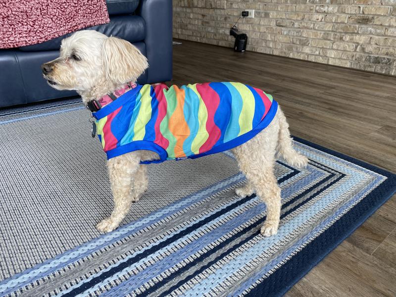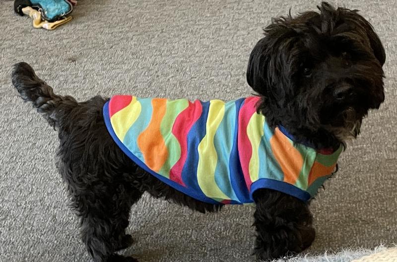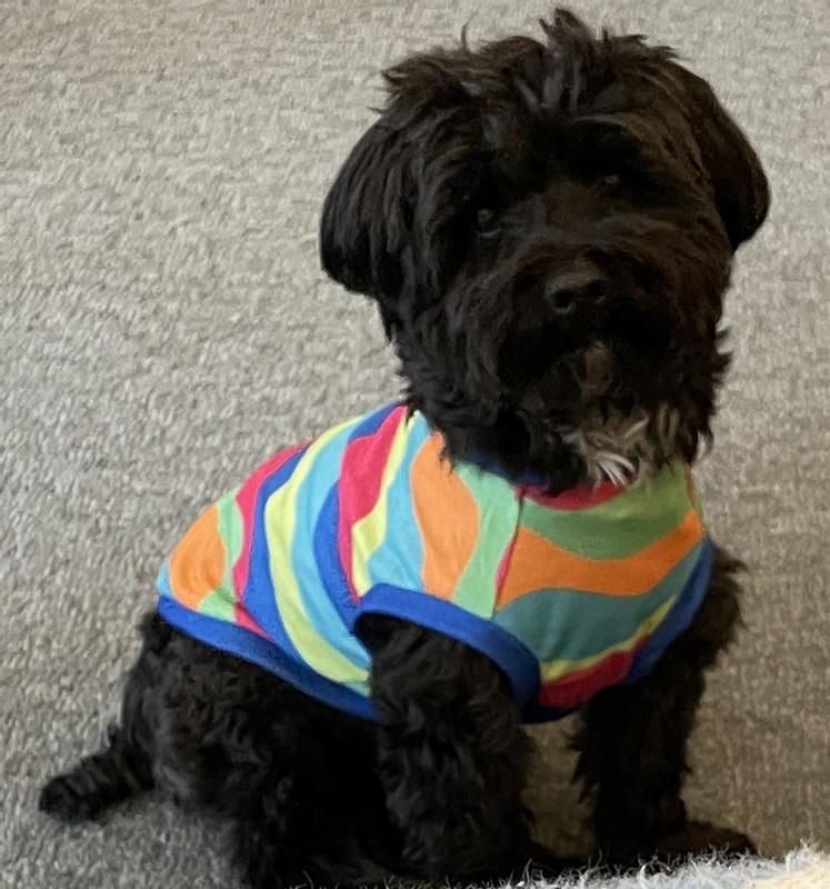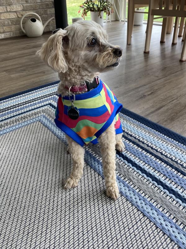 Hi! I'm Baxter, a 14lb Schnoodle rescue with a need for colorful fashion forward shirts! My lack of an undercoat leaves me cold most of the time, so I was dancing with the happies when my mom put this on me! I love it so much I don't want her to take it off me, not even to wash it! We love how colorful it is, and that this one is light weight, easy to care for material, which is perfect for spring! And the easy care means I don't get in as much trouble for rolling in the dirt and grass right after the mower finishes. That's always a plus! Mom also says this is a very well made high quality muscle shirt which makes me look cuter than I already am, which I know isn't pawsible, but that's what she says. And when she's happy, I get more treats, so it's always a win win! I'm all in style and ready for summer fun in the sun!!! Tell your humans to get you one of these and you'll have so much attention, you will love it!