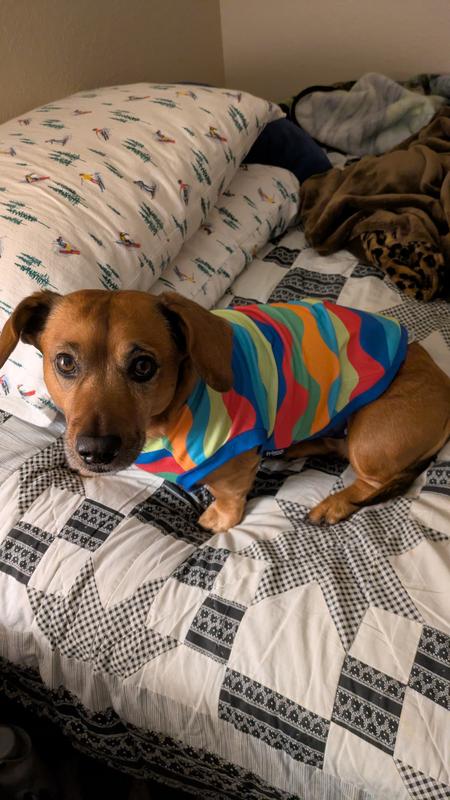 This is such a cute shirt for any small dog or cat. It's very colorful, the fit is perfect, the material is nice and soft and stretchy. It looks adorable on my little Shih Tzu, and he loves it. I put it on him and he's just prancing around like, look at me Mom, it's so cute!