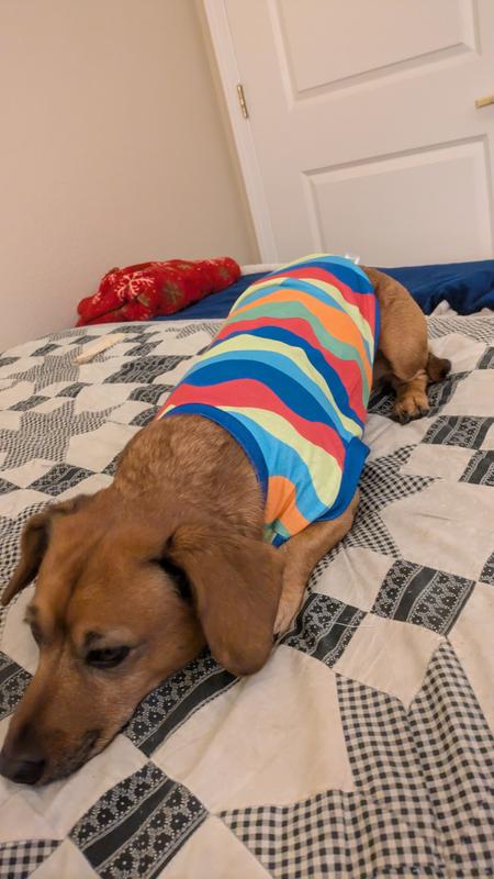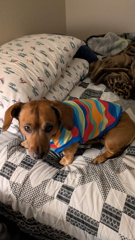 I love the colors, material and quality of this shirt. One big problem: The leg openings are HUGE. It fits otherwise, but my mini-doxie gets one leg out. She either barks for me to rescue her if she gets stuck, or hobbles around with one leg out and one leg in. I took the shirt to a seamstress, but she said she couldn't make the leg openings smaller without making the body smaller. Many shirts are made this way, and I don't understand why! I'm disappointed!