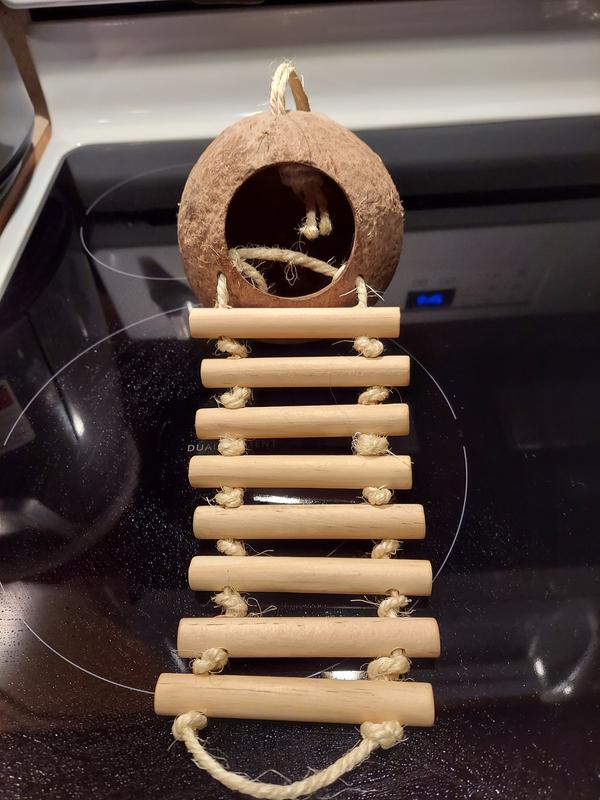 Canaries play all over this and like to perch on the ladder rungs. They were going in and out of the coconut shell until two of them decided that it would make a good nest.