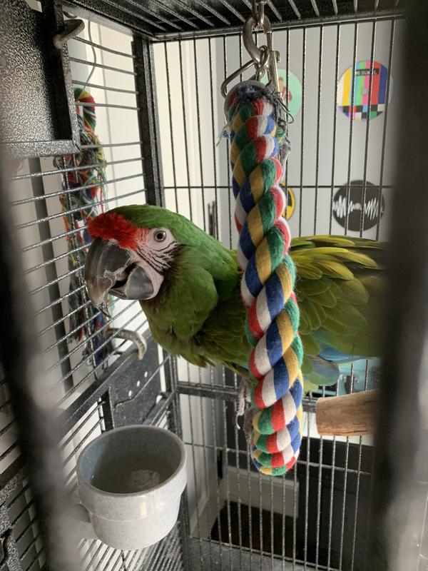 This coconut toy was enjoyed by my military macaw, Max. Bird toys do not last long here , but this one after a week is still on the cage m, less the ladder. He loves to hang by the rope and make noise with the coconut shell. I also put a few pieces of food in the shell for him to forage. This toy was a good value!