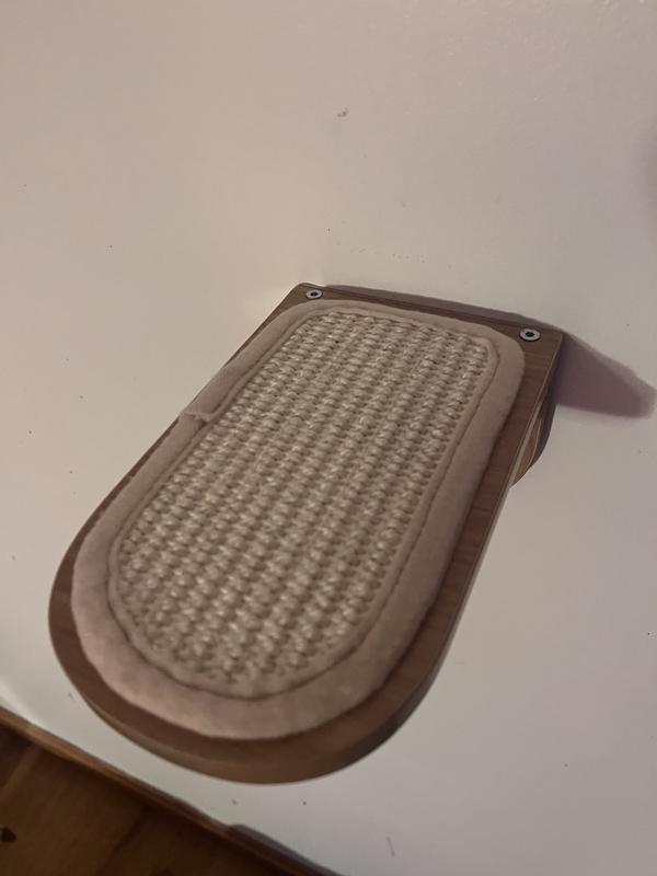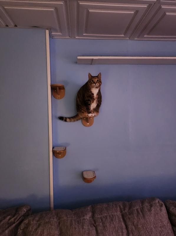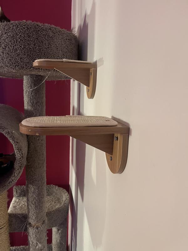 These little wall steps are a great addition to any cat wall. I used the to fill a space between an existing large shelf and a u-shaped carpeted wall lounger that my cat now has trouble jumping to in her older age. They were easy to build and install, though it was difficult to screw in the top two screws as they are very close to the step top. Lowering the predrilled holes a bit would be beneficial! I also had no idea how to use the type of dry-wall screws included, and they didn’t come with weight ratings, so I used my own. I found the stickers on the wood for the steps very difficult to remove, and the residue is quit unsightly. I did figure out most of it can be covered by the sisal pads without removing it at all. But it was a little frustrating. The wood is good quality and I like the natural, neutral color. It is easy to clean, and my cat doesn’t seem to mind using them. It has made it easier for her to get from point a to point b.