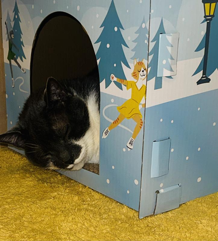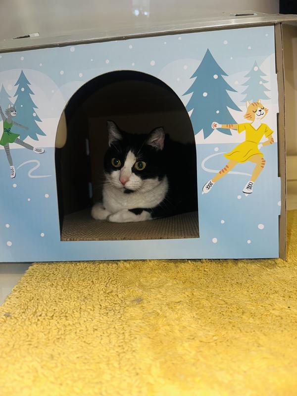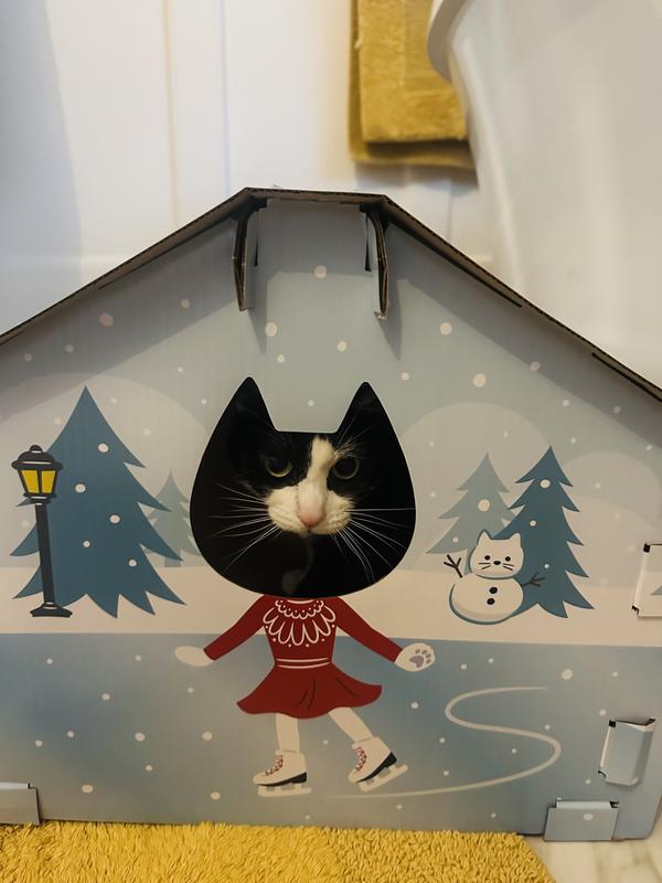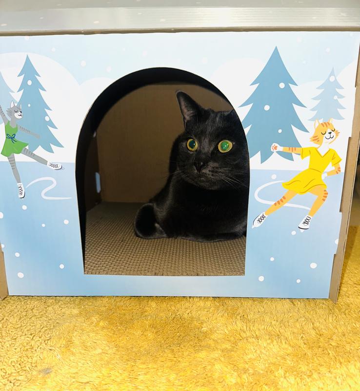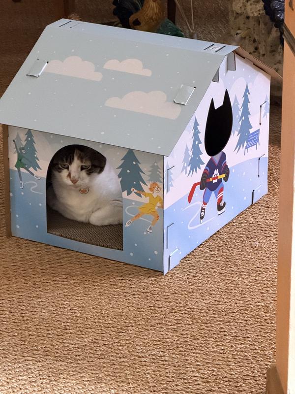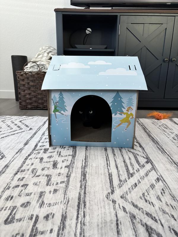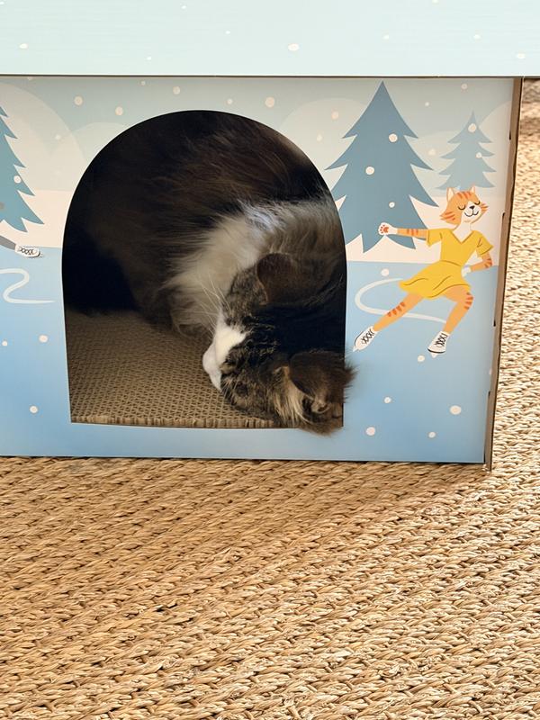 • This cardboard cat house features a frozen lake design depicting Winter ice skating and hockey for sporty, seasonal style.