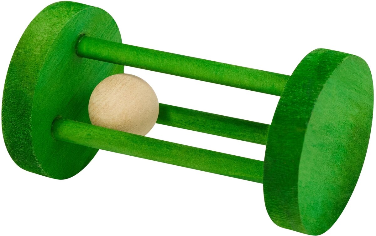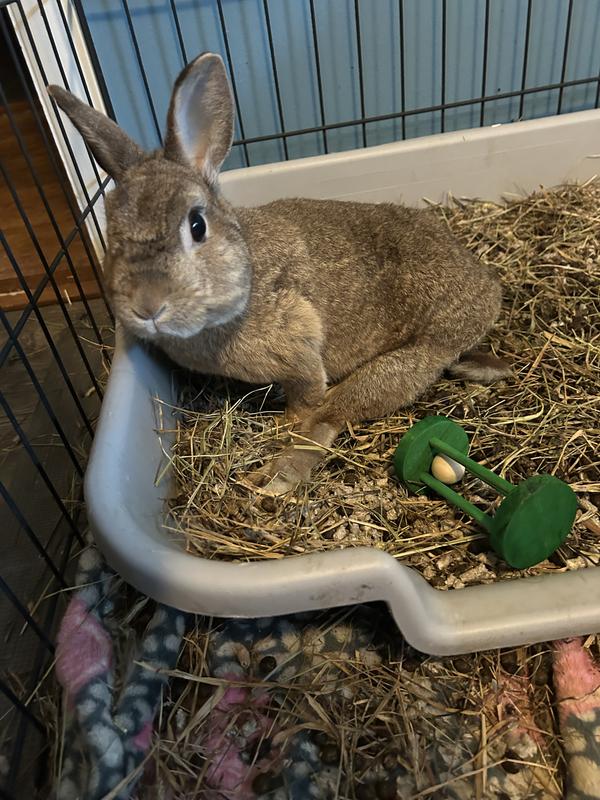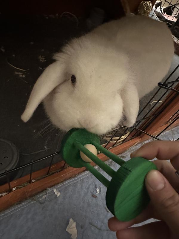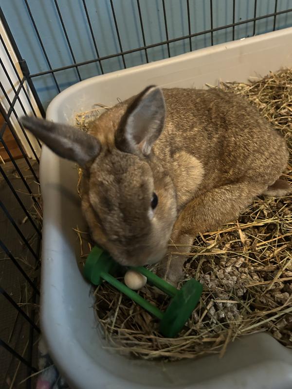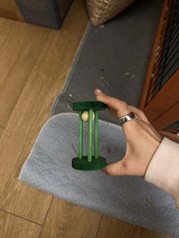 My rabbit enjoys throwing this toy around! I don’t prefer the dyed wooden chew toys but thought I’d try this one anyway. I like that it makes some noise when the ball rolls around on the inside, it entices my rabbit to play with it more. It’s also big enough that it will take awhile for him to chew.