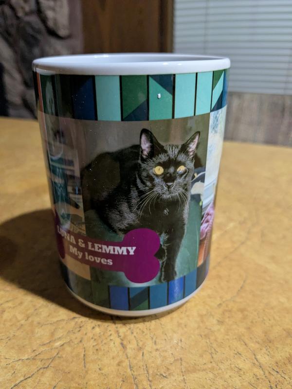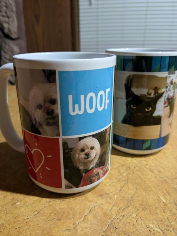Mugs are very cute & nice quality - but was disappointed colors are much darker & more drab than they looked on computer or phone screen. Also, I ordered a second mug because I mixed up which photos would be on the front. I used same photo that was stored in my account from the first mug. But in second mug, the top of my dog's head was cut off in photo. If not for those two disappointing issues, I would have given it 10 stars because it is so cute.