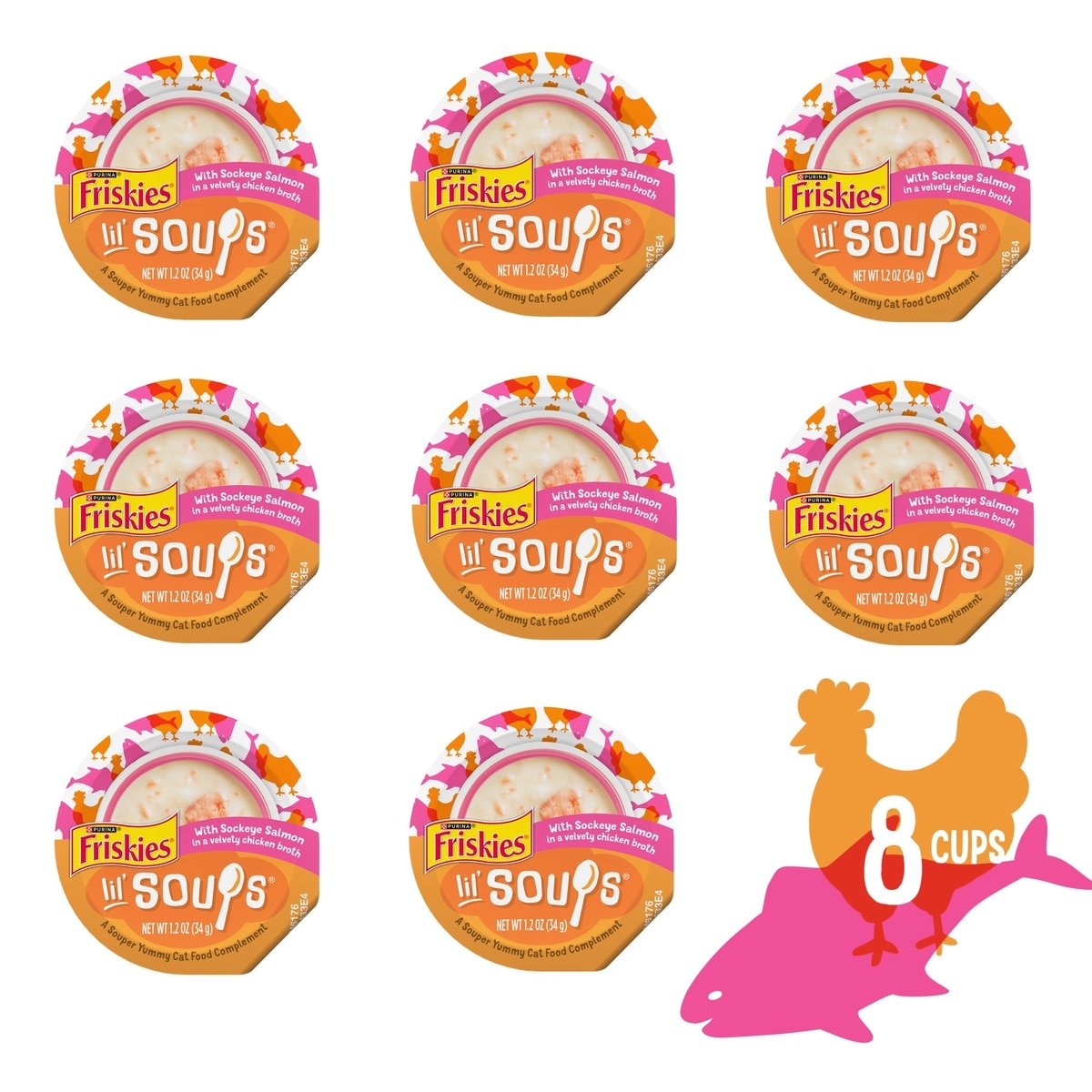 - Friskies Lil' Soups with Shrimp in a Velvety Chicken Broth Lickable Cat Food Topper, 1.2-oz cup, case of 8$10.24 Chewy Price$10.64 List Price$9.73 Autoship PricePromo, New Customers Only: Spend $49+, Get $20 eGift Card +1 deal