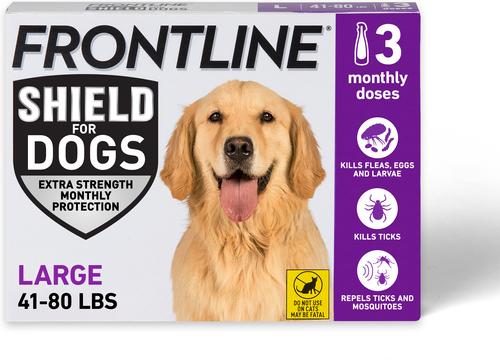 - Frontline Shield Flea & Tick Treatment for Extra Large Dogs, 81 - 120 lbs, 3 doses (3-Month Protection)$52.48 Chewy Price$59.99 List Price$49.86 Autoship PricePromo, New Customers Only: Spend $49+, Get $20 eGift Card +1 deal