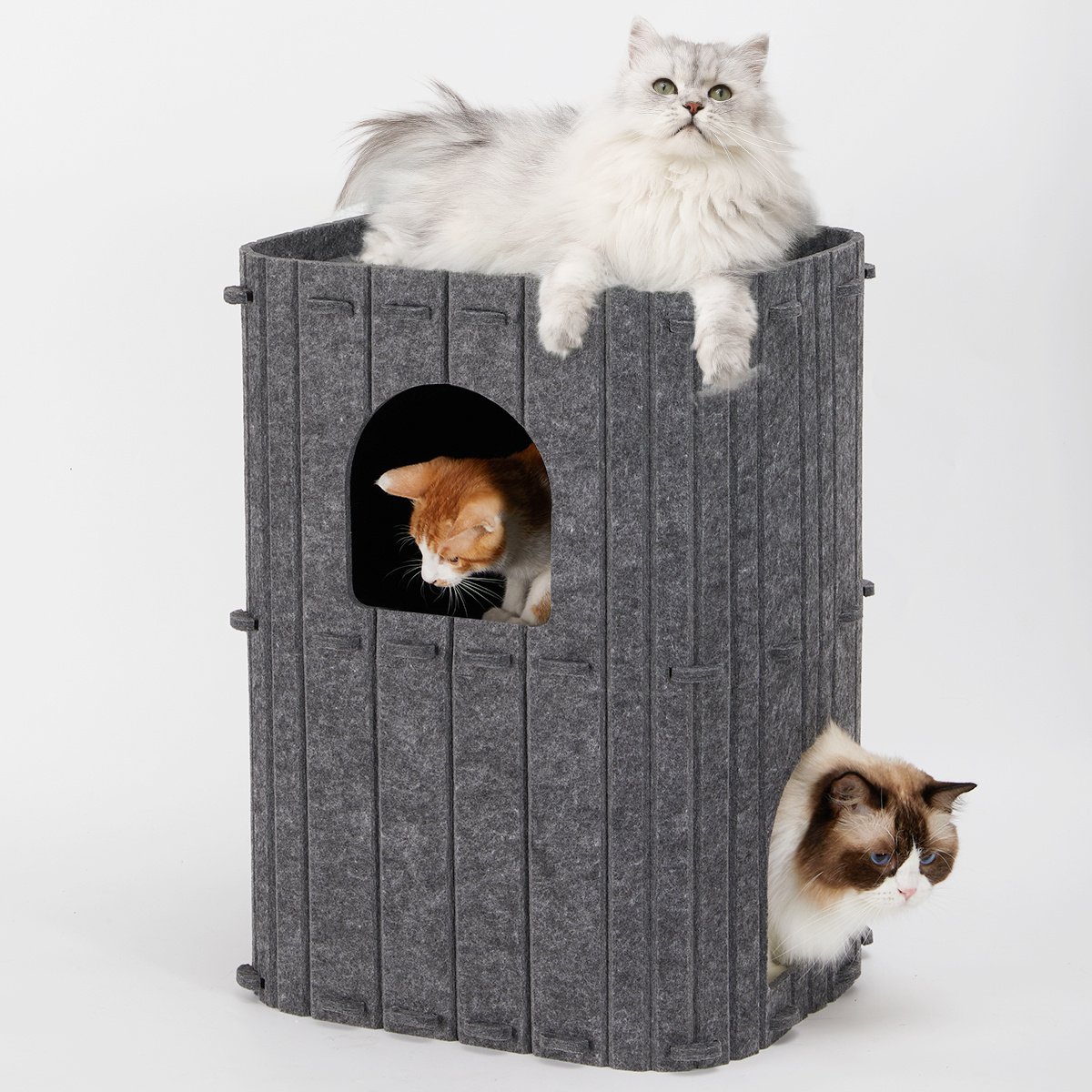 FUKUMARU 2-Story Bed Cave & Tunnel Condo Felt Cat Hideaway, Dark Grey