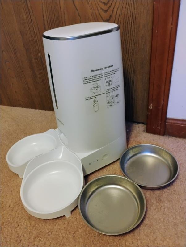 The feeder appears sturdy, easy to clean, and holds a lot of food. The 2 metal dishes are easy to remove and clean. The unit can be operated with batteries only if needed. The app was easy to download, however, it required a weekly or annual subscription fee, which I am unwilling to pay. It also made you download an easy screen app which messed up my cellphone display, was not helpful, so I had to uninstall both apps. Sadly, I could not test out his unit without the apps. I will donate it up a pet rescue.