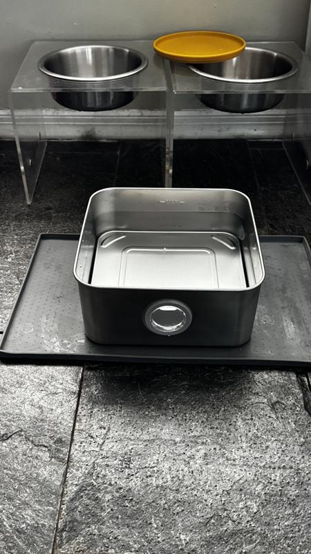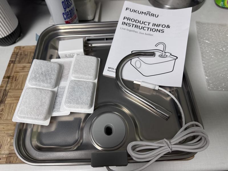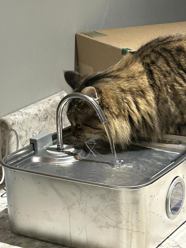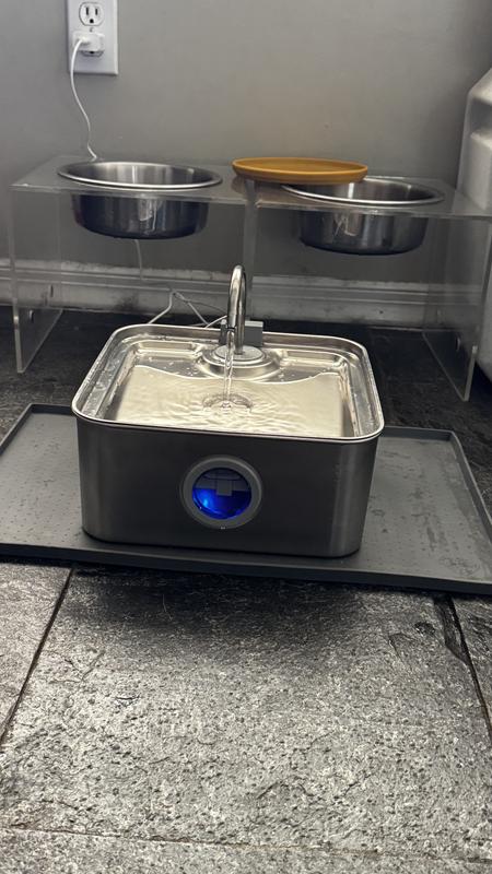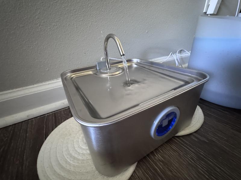 Assembly was fairly easy, although nowhere in the instructions did it say how to connect the pump to the container. The water seemed to get very close to the back edge without the faucet, so I opted to put it on which made it flow more to the front. A few cats have checked it out and used it in the few days I’ve had it running. The pros: It holds more water than I expected when I first saw the box, and it’s extremely quiet. I like that the light changes color when it’s low and that it has an auto shut off feature for if it runs out of water (although I have not experienced those yet). It’s stainless steel which is much easier to clean than plastic. The cons: I don’t think a dog would be able to drink very easily from it unless they are drinking from the faucet itself (or are a very tiny dog) as the water is extremely shallow. With the number of animals I have, I will likely need to replace the filter more more than every two weeks, but even 2 weeks seems like a lot to me (I have not used a pet water fountain before so I’m not sure how that compares to other brands). I also do not see the filters available for purchase from this website, but I do see them on one site I haven’t heard of, and see similar shaped ones on a more common site.