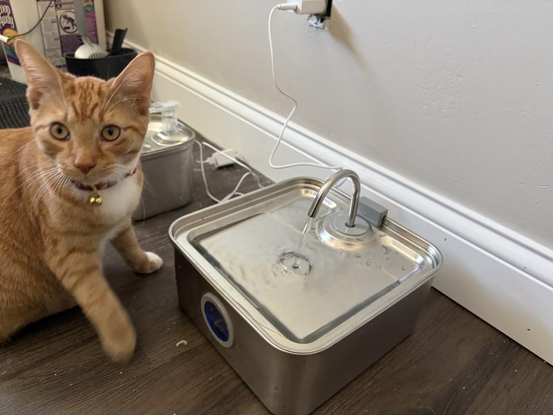 I have never owned a pet water fountain before but wanted to try one to see if it would encourage my cats to drink more water. The fountain itself is very lightweight, which concerned a little bit as I have a cat who likes to tip water bowls over but once filled with water, he isn’t able to flip it. It was very easy to set up - inserting the filter and the water spout. The instructions do say to replace the filter every two weeks which seems like a lot but a quick search online shows the replacement filters are fairly inexpensive. My cats were intrigued by the fountain right away and weren’t too scared by it as it is fairly quiet. They have repeatedly chosen to drink from the fountain rather than the other water bowl so I’d say they are a fan! I like that it has a window on the front that shows blue if the water level is good and red if it needs to be filled - very easy to see! The fountain is also easy to clean and reassemble. I do wish it had an option for battery power as the cord limits where I can put it. Overall, a great product!