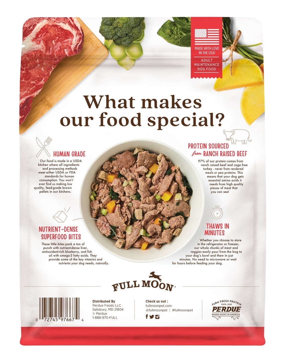 Full Moon believes dogs deserve food that’s every bit as good as what humans eat. Every Full Moon recipe starts with USDA-approved, farm-raised meats carefully cooked in small batches, for quality and taste that’s evident in every bite.