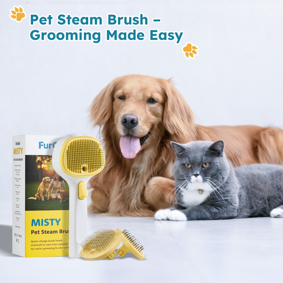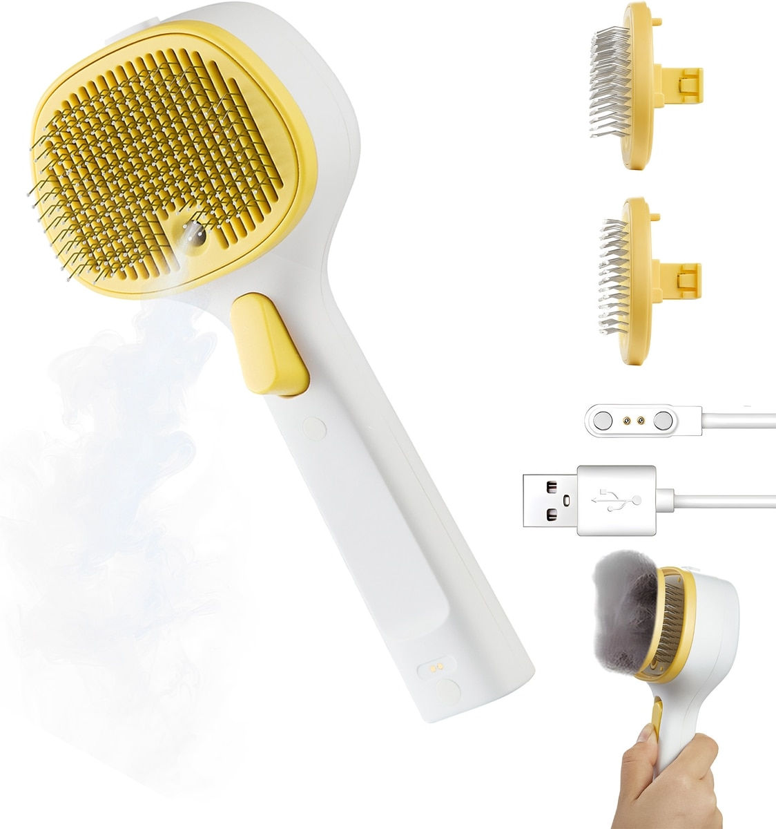 FURGO 3-in-1 Anti-static Steam Brush & Deshedding Tool for Dogs & Cats, Yellow, Long/Short Head