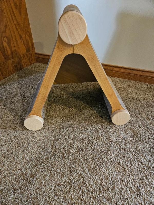 Mounts easily to the wall, simple to put together takes about 10 minutes to install. Was an instant hit with our juvenile kitten. Multipurpose scratcher and hid