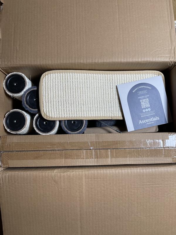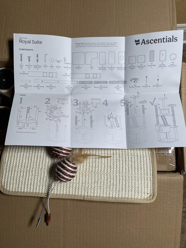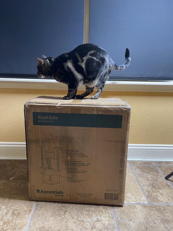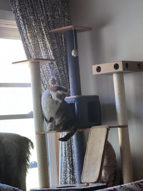 The FurHaven Royal Suite Cat Tree is stylish and has some fun activities our cats. Despite the height, this tree takes up a relatively small area. It's about 19" x 19" square at its base, and a few inches wider towards the top from the platforms jutting out. The posts are made from what feels like very dense cardboard. They are covered in a soft scratchable gray material or sisal. Our cats definitely enjoy scratch the posts. The posts are high enough that they can climb up the sisal posts. The suites are made the same gray felt like material. They are flexible and wrap around posts connecting with velcro. They are not solid boxes like you may find on some cat trees. The smaller of the two boxes is about 10" x 10" and our cats are too large to fit into it. This smaller suite is kitten sized, or a very small cat. The lower suite is a more generous size and any one of our cats can fit into it easily. The bamboo material is stylish but can be slippery and the platforms are quite small for larger cats. There are exposed screw heads due to the design. The toys and activities are top notch. They all screw into place and are not stapled like you might find on some cat trees. Due to the screw fit, they should be easily replaceable if Furhaven offers that. The toys are wrapped in sisal, there is a punching bag style toy on a spring, and a more traditional feathered ball hanging from elastic. Finally, there is a stiff carboard box with ample holes and a couple of plastic balls containing bells. Our smallest cat Mini enjoys batting around the balls from all angles with her paws. The instructions were clear, and there is a QR code you can scan to watch an assembly video. One thing I did not care for was that while the parts are clearly displayed and labeled in the manual, the actual parts do not have labels. So, you need to match them up to the parts in the manual and it can be easy to make a mistake on similar looking parts. This cat tree would be perfect for cat owners with small cats and/or not a lot of space for a cat tree.