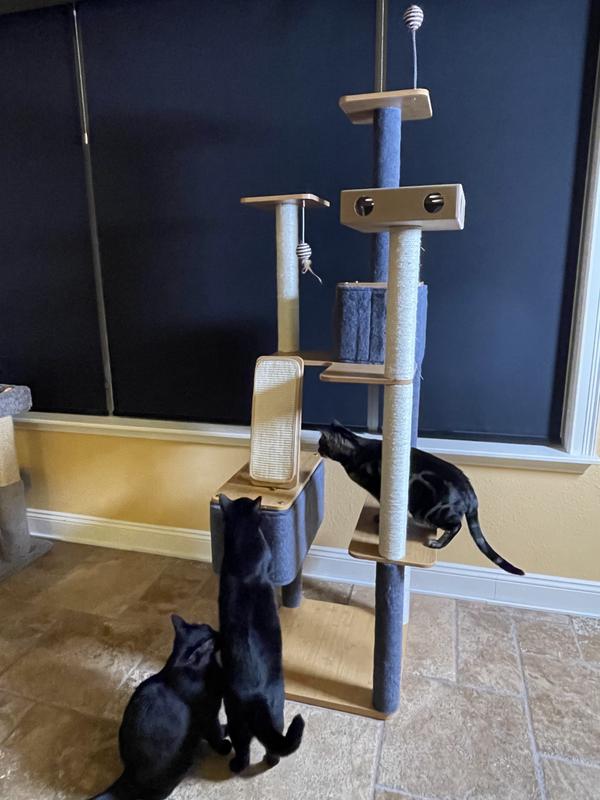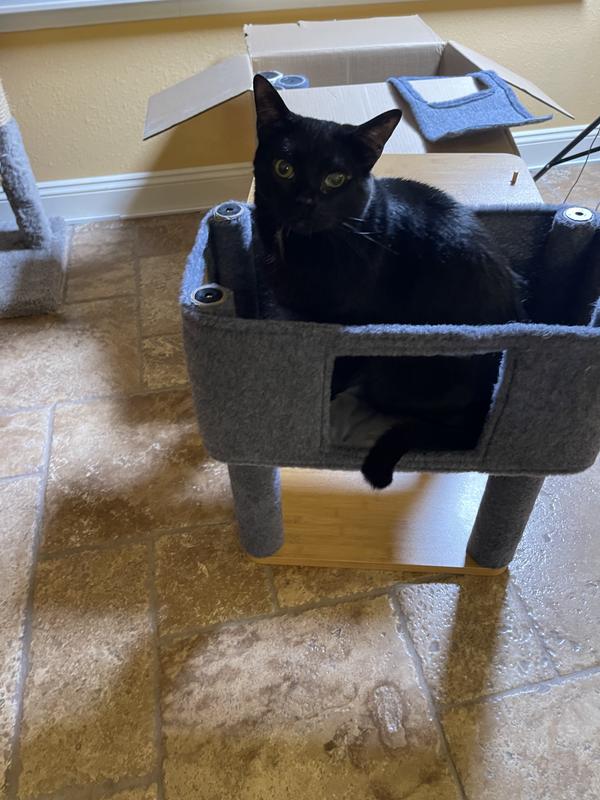 The FurHaven Ascentials Royal Suite Cat Tree is a beautiful and sturdy addition to my home, and my cats, Toodie and Binx, love it! The bamboo and gray design is sleek and modern, and it offers several entertainment and lounging spots. However, I would love to see a larger cubby on the middle tier, as the current size isn’t spacious enough for my cats. My cats try to squeeze in, but it just doesn’t work. My cats are also on the larger side (my smallest is 15.6 lbs. largest 20.9lbs), so wider platforms on the top would be a great improvement for bigger cats like mine. Overall, it’s a fantastic cat tree, but some adjustments for larger cats would make it perfect!