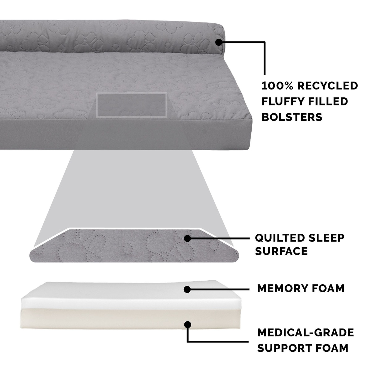 - Fluff-filled bolster railings support the neck, back, hips, and joints to ease discomfort and encourage restful sleep.