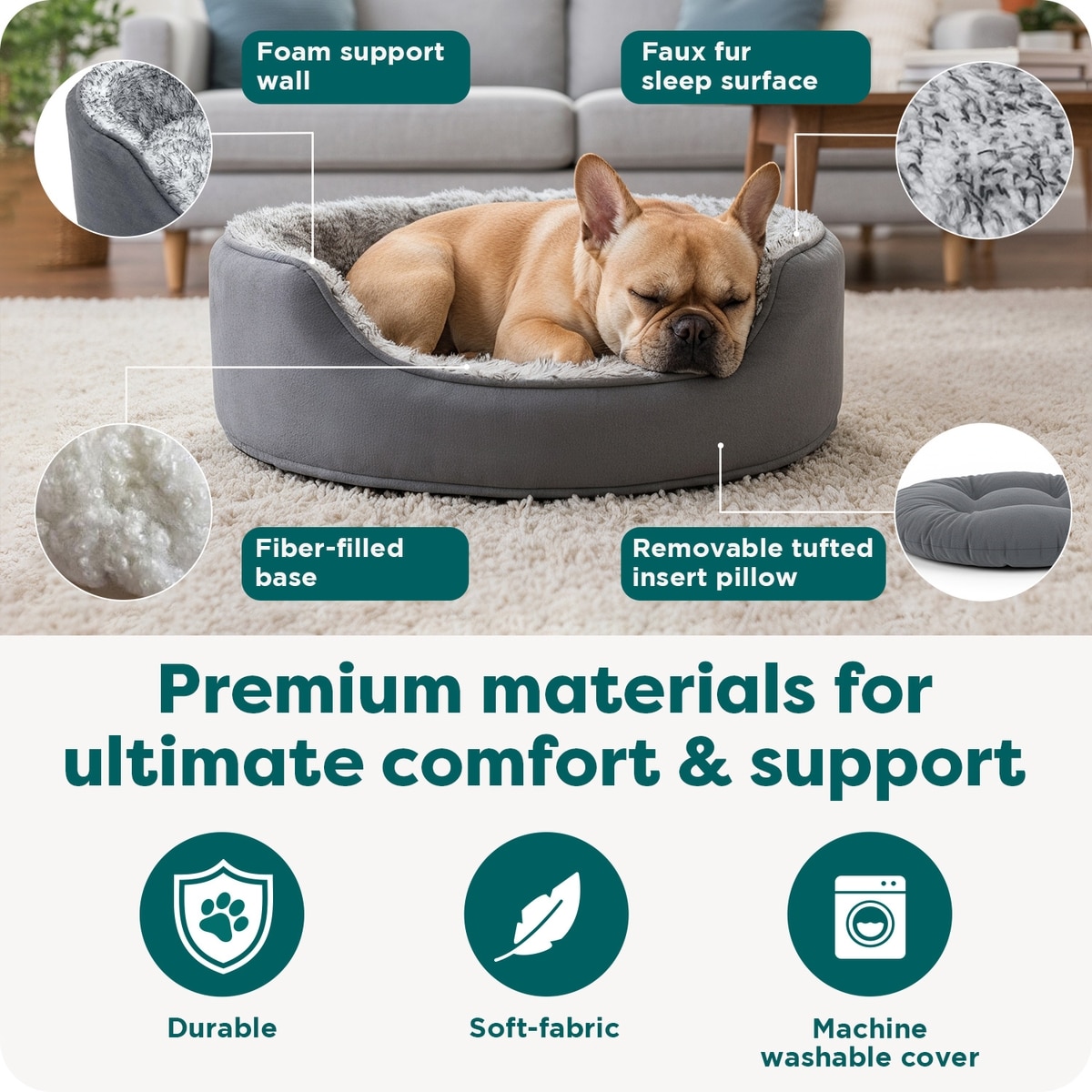 FurHaven Two-Tone Faux Fur & Suede Oval Dog & Cat Bed, Gray, Medium