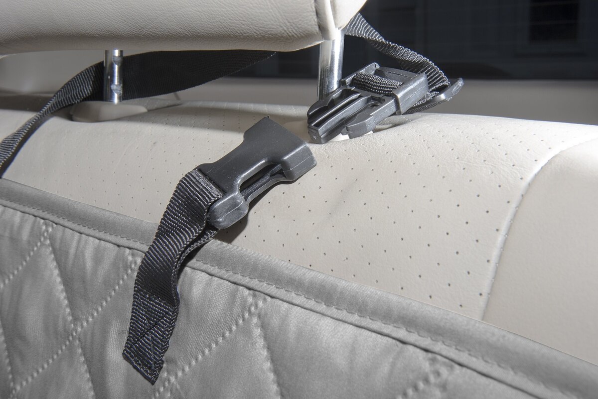 - Buckled straps are adjustable and loop over headrests for easy installation.