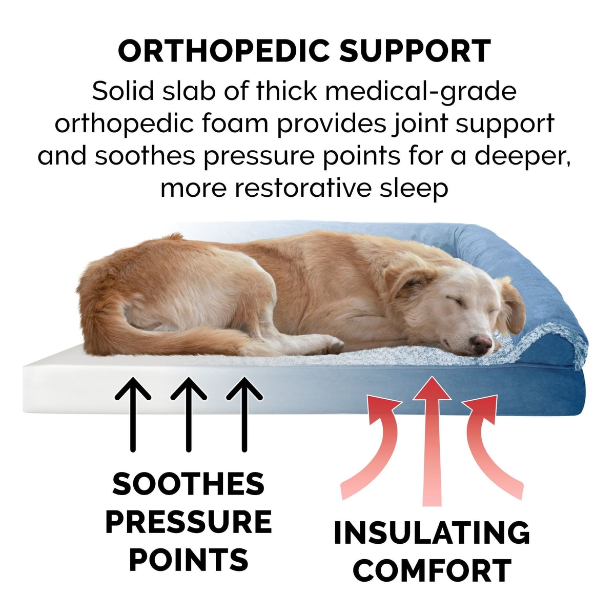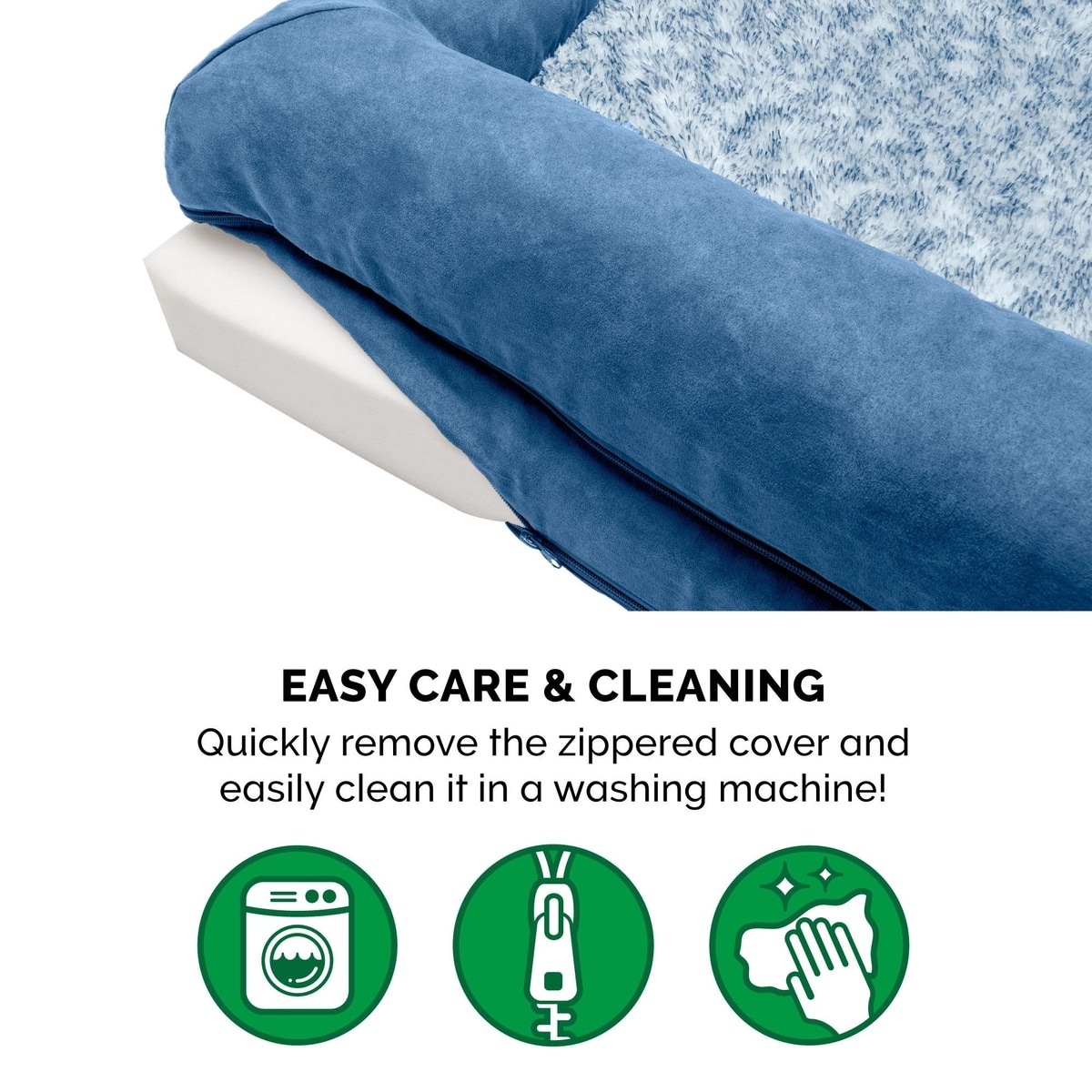FurHaven Two-Tone Fur & Suede Orthopedic Cat & Dog Bed with Removable Cover, Marine Blue, Large