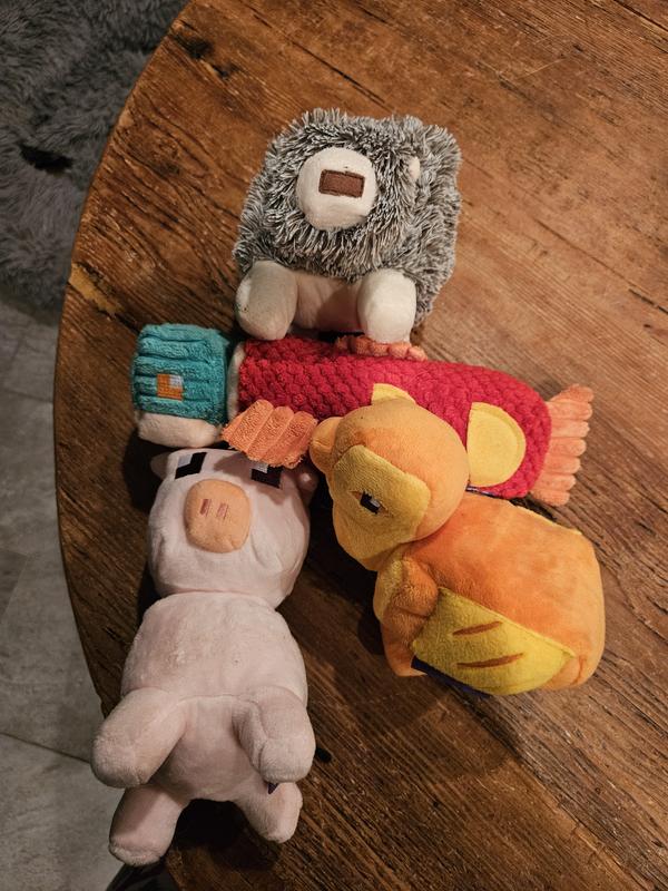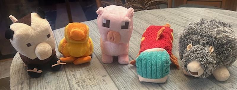Five adorable pixelated, bright colored, crinkly, squeaky stuffed animals! The hedgehog has quickly become the favorite of our 38-pound Australian Cattle Dog/Chihuahua