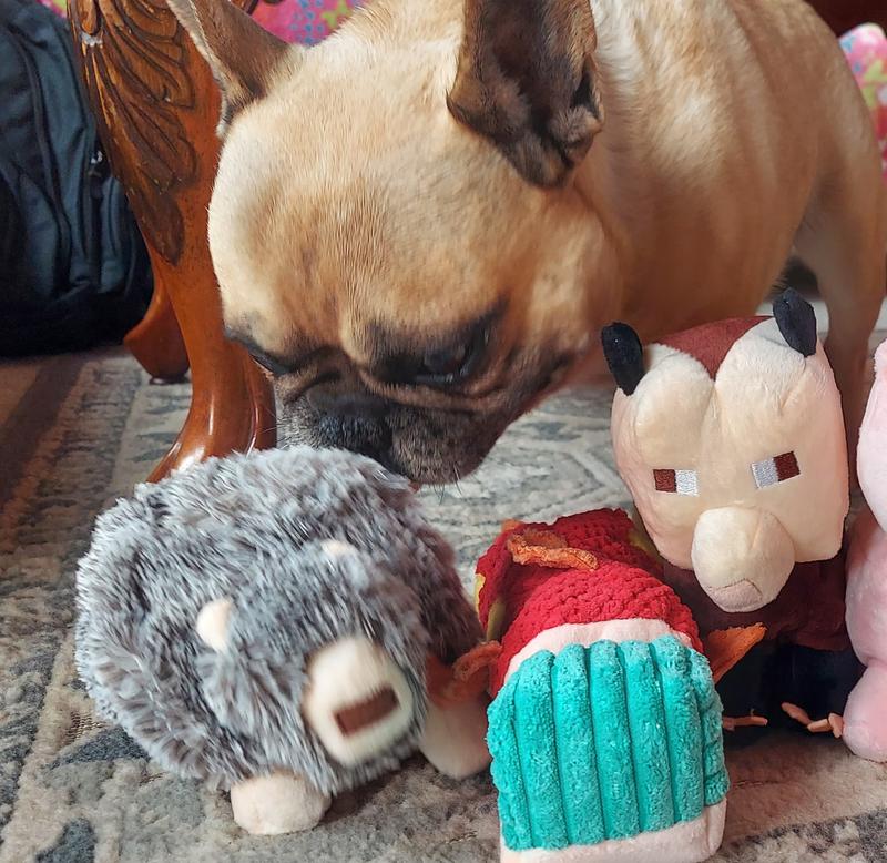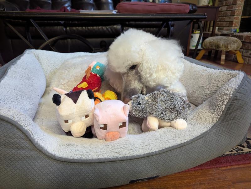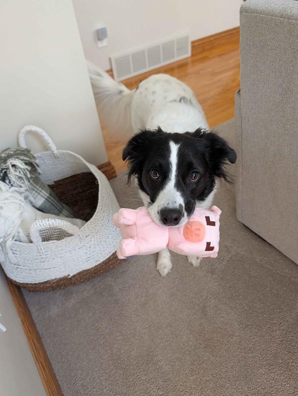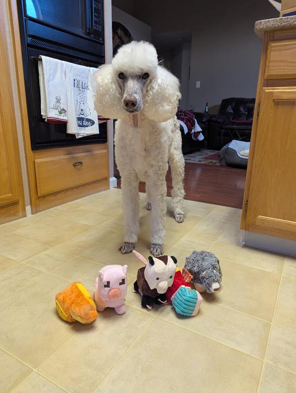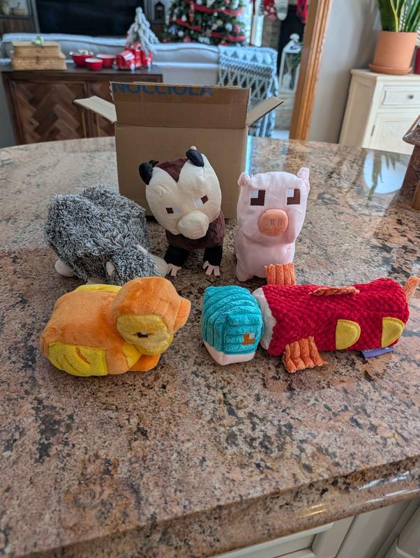 Five adorable pixelated, bright colored, crinkly, squeaky stuffed animals! The hedgehog has quickly become the favorite of our 38-pound Australian Cattle Dog/Chihuahua mix, and surprisingly our three-legged cat has claimed the duck. The plush toys feel well-made overall; just keep an eye on a few dangling bits (like the pig’s tail or the possum’s toes) if your pet is a focused chewer. The squeakers are small and a bit harder for our dog to activate compared to other toys, but wow, are they crinkly! We’d definitely recommend these.