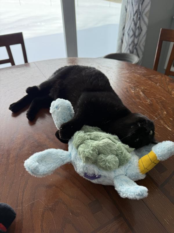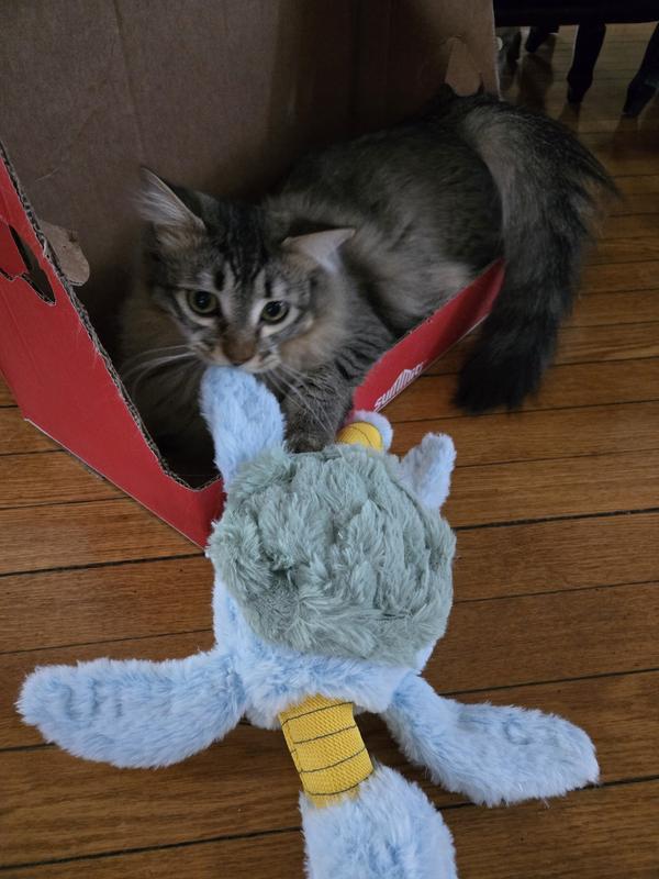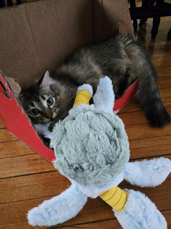 This toy is meant for my dog, but as soon as I opened the box, my kitten was in love! It's super soft and squishy which my cat loves but my dog appreciates the squeaker