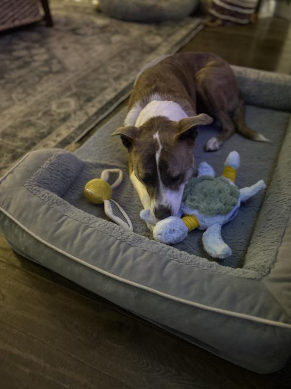 My puppy was looking bored so I gave him the plush turtle dog toy. It actually engaged my other dogs in keep away, tug and triumph to explore everything this Turtle has.