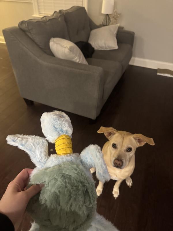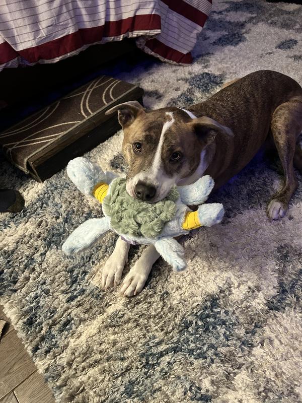 My dog loves his stuffed animals. This was no different. He played with it for hours a day and on day 4 he was able to find a weak spot and open it. It’s a well made toy and it has longer arms and neck for them to grab or play tug of war with. It’s a great toy for dogs unless you have a heavy chewer.