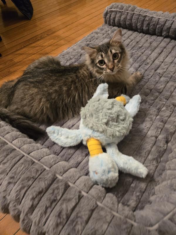 This toy is meant for my dog, but as soon as I opened the box, my kitten was in love! It's super soft and squishy which my cat loves but my dog appreciates the squeaker and enforced neck and tail for gripping and shaking. It's been a great addition for both my cats and dogs.