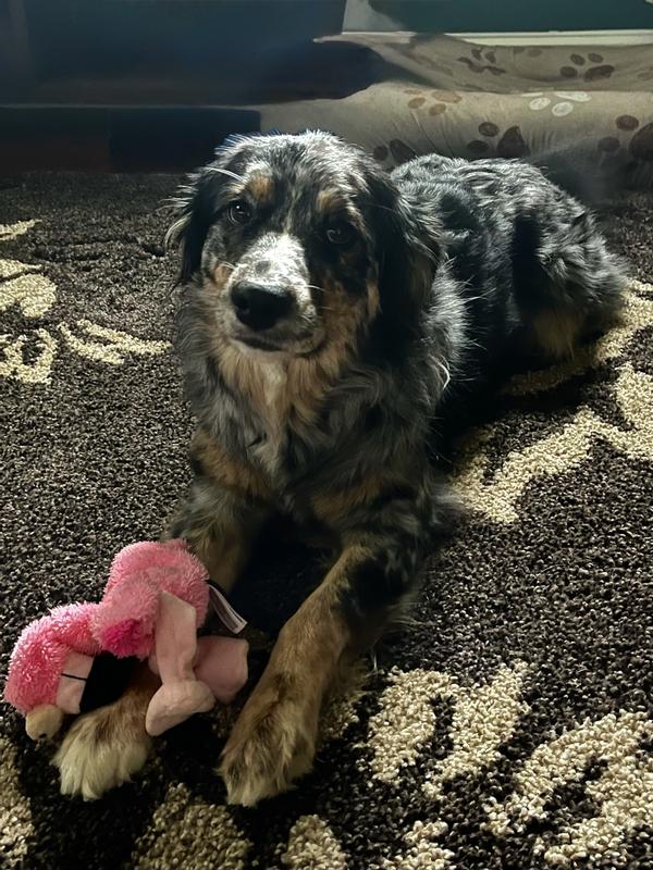 Sadie will grab this soft toy and take it with her into her crate. No stuffing is great!!