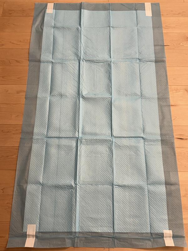 These are huge potty pads, and you get a literal lot of them! Buyers clearly know what they need these for, and the pads don't disappoint. They're mostly standard construction with a waterproof bottom layer and absorbent top layer; enough said. However, these are even better than many regular pads because they have stickers at the four corners to help them stay in place. They are also well-priced for being disposable. Obviously they're not washable, reusable, etc. but hopefully you won't need them for too long. See photos for a sense of scale with a medium-large dog.