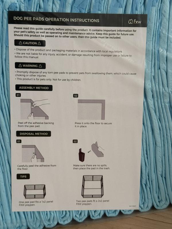 The FXW pee pee pads are everything you want and more! They are a very large size and they have have stickers on the underside so they don't move around on the floor! This was an added bonus. We use pee pee pads when cleaning out cages (yes, we have baby chickens that are a few weeks old almost ready to go outside.) We do also line our guinea pig gace with pee pads and we only had to use 1 pee pad for the entire cage. We even had to tuck in the sides to fit their 40 inch cage. These would be great for older dogs and puppies as well. There is enough room for them to go on it. I used to foster and I would buy these everytime for puppies and older dogs.