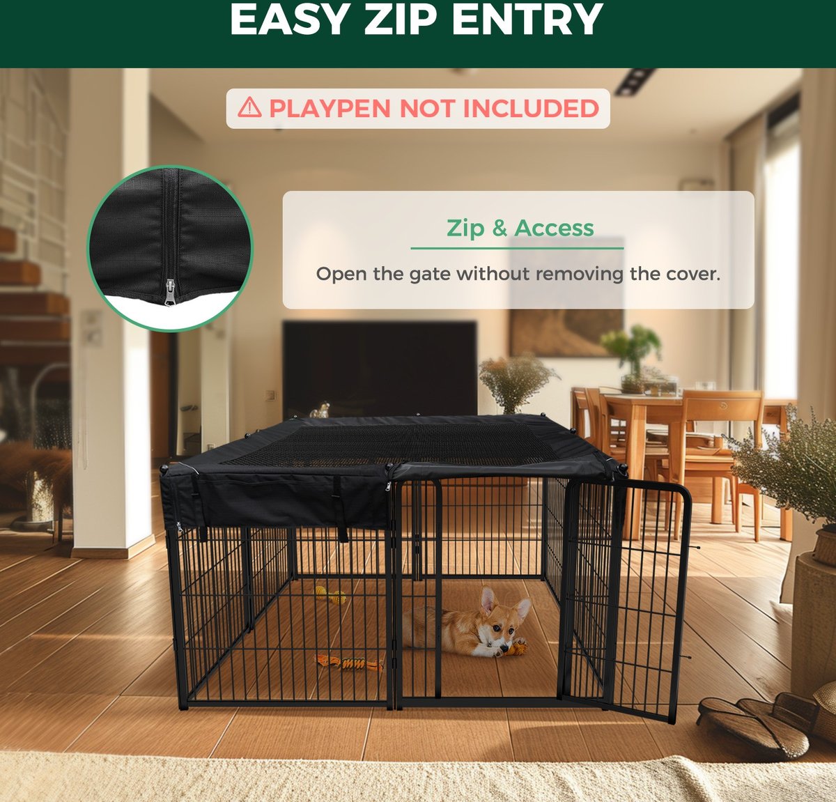 INSTALLATION: Find the location of the door. Align the playpen cover with the playpen. Insert the ring into the rod's head. Attach the Velcro to the wire. Pull up the zipper and unfasten the two Velcro straps on the door to open it. The storage bag can store dog supplies.