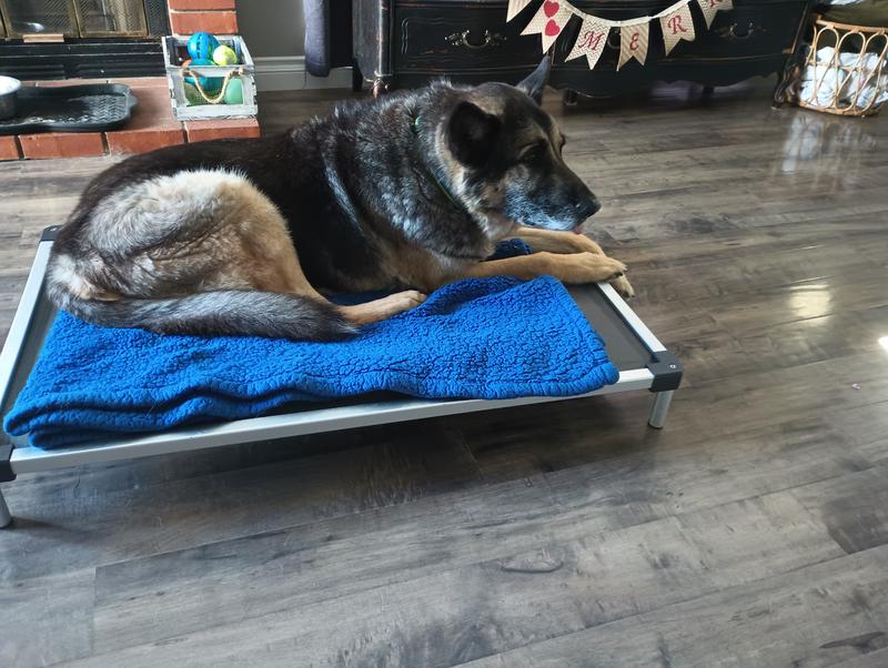 This is the outdoor bed I have been searching for. I ordered the medium 47inch and it's a good fit for my older 70-80lb GSD. The other dogs have been unable to destroy it and when my little one marks it, it rinses off easily and is waterproof. He only likes it with a blanket on top which is hard because my girls drag the blankets off the bed when outdoors. It is expensive but seems sturdy enough to last a while.