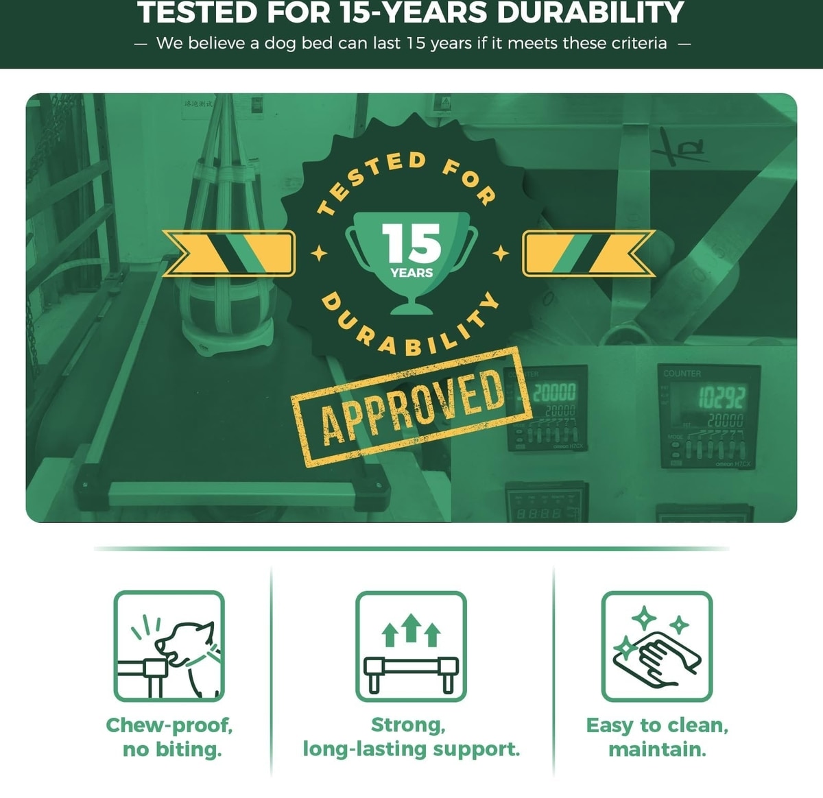 I have a dog that chews beds to bits but since the edges are metal he hasn’t been able to put a dent in this. I have several outside too to let them get off the