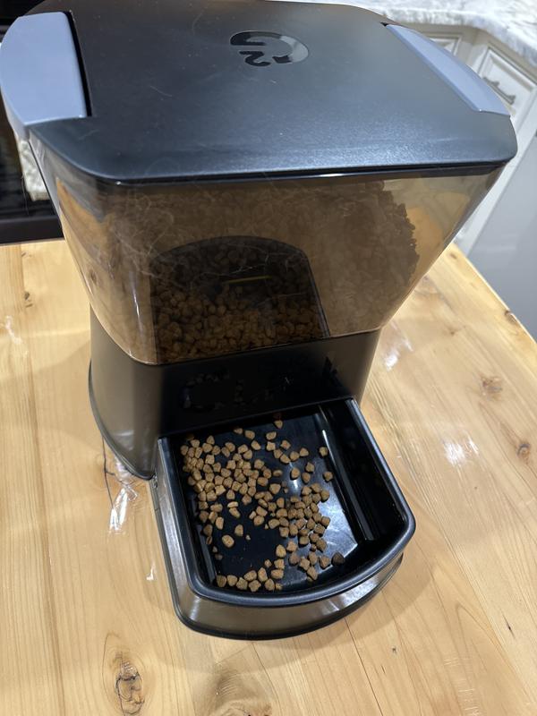 - Offers measured portion control—1 click dispenses ¼ cup of food into your fur-iend’s bowl.