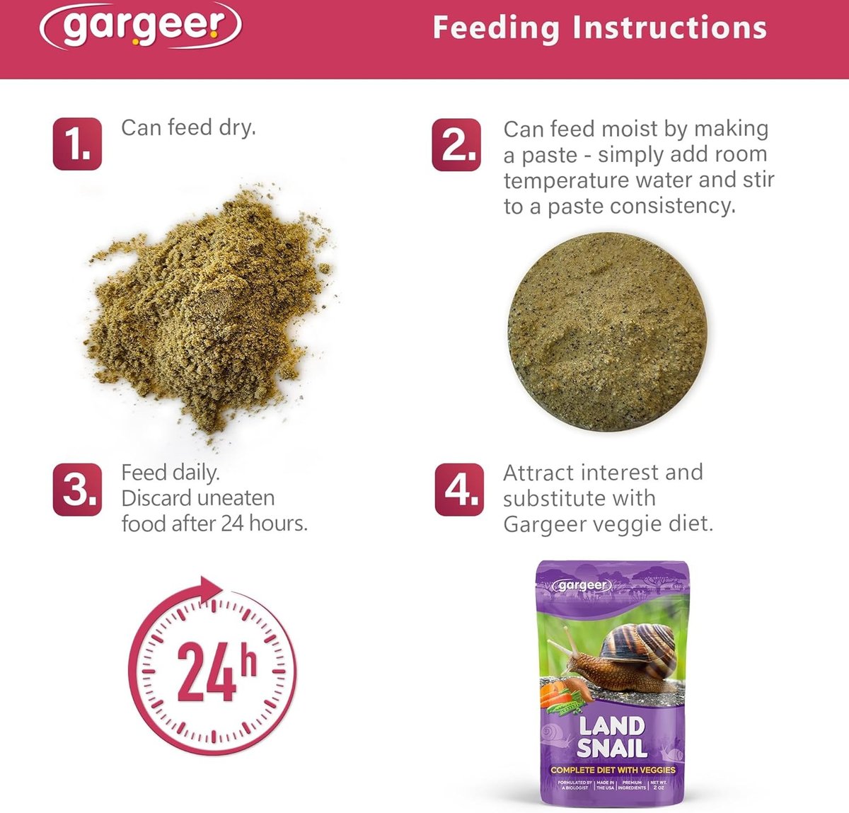 Feed can be offered dry or moist. To make a paste, simply add a small amount of room-temperature water and stir to desired consistency. Feed only what land snails can consume in a 24-hr. period. Remove uneaten food and replace with fresh food daily.