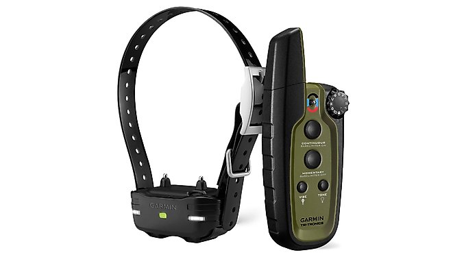 About Garmin Both the handheld transmitter and the dog device collar are designed to withstand all the conditions of training and hunting. The collar comes with 2 lengths of removable, stainless, insulated contact points for comfort and performance in wet conditions.