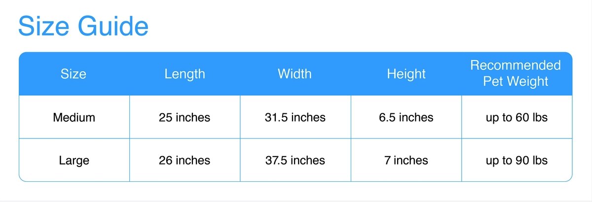 | Large | 26 inches | 37.5 inches | 7 inches | Up to 90 lbs |