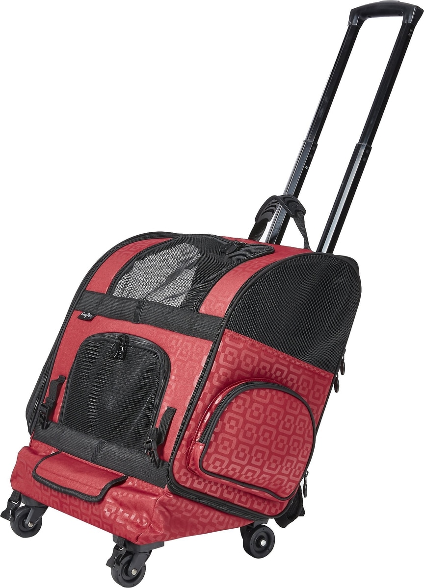 I've had this carrier for several years and it has carried cats-all sizes and all states of mind ( you know what I mean if you have a cat), plus it carried my inseparable "twin" puppies ( a yorkie and a chi) from 8 weeks old through to the end, together! It's very roomy if you have to take two small pets, a 22 lb. cat, or one pudgy English bulldog puppy who weighed more than 25 lbs. I have appreciated the smooth wheel action on various surfaces- just picked it up with the handle if going over grassor steps, the reliable and sturdy zippers have never stuck, the telescoping handle does not weakly twist and turn, it stays in line with the carrier part. There are two side pockets for meds, vet notes, toys or treats. It can belt into the seat of my car, and though I have never used it as a back pack, the straps look well padded and sturdy. I like that the soft fabric pieces inside ( back and bottom) can be taken out and washed, and that there is a small tether inside for a collar. There are other carriers out there but none have all these features and the amount of space for this price. I just recommended this rolling carrier to a friend who just adopted two inseparable baby Dachsund siblings which she takes in to work along with her work bag and their "baby bag". The hard carrier she has been using is heavy and cumbersome and is hard to carry along with all the bags she carries in to work.