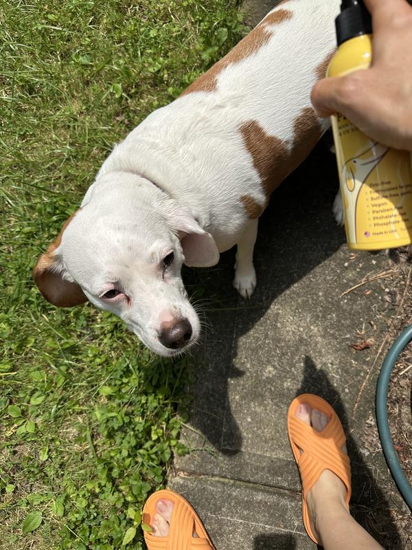 I’ve been using this pet sunscreen on my senior dog, and I’m impressed so far! My little old man has a light-colored coat and sensitive skin during the summers here in Florida, so I’m always worried about sunburn when we’re out on walks or at the beach. He absolutely loves being outdoors and his coat isn't necessarily the best given his age, so sun exposure was always a concern of mine. It goes on easily (not greasy at all), has a pleasant, mild scent, and doesn’t bother my dog at all—no licking or scratching while it being on his coat. I love that it’s made with soothing ingredients like aloe and olive oil, so I feel good about what I’m putting on his skin. I do almost always wipe him down and give him a bath when needed, so I'm not entirely sure how long this can stay within his coat.
