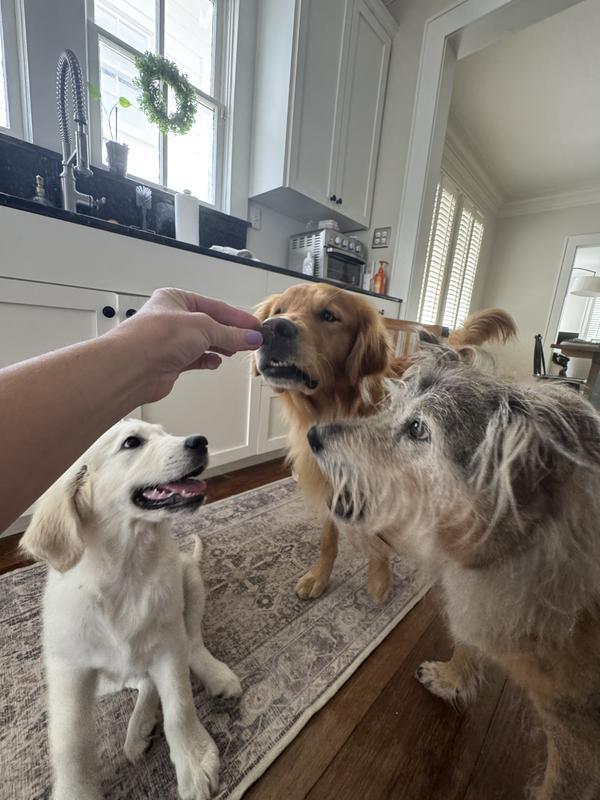 I have 3 dogs. A 13 year old female mutt at 64lbs, 3 year old male golden retriever, and now a 17 week old golden retriever female. When my 13 year old was paralyzed last September, she was switched over to a prescription food for her gut and I later switched my 3 year old to it as well. Due to finances, I am trying to switch them back to something non prescription. However, neither of them have had solid poop except for this prescription food, so I was looking for something to supplement whatever is giving them good poops. It’s important to note that my golden retriever boy was never interested in food. I mean, not even cheese or sandwich meat! But he eats these. All 3 of my dogs love these treats so I’m pretty impressed. It didn’t cause upset stomach to any of them either and they continue to have solid poops! It’s a win win in this house!