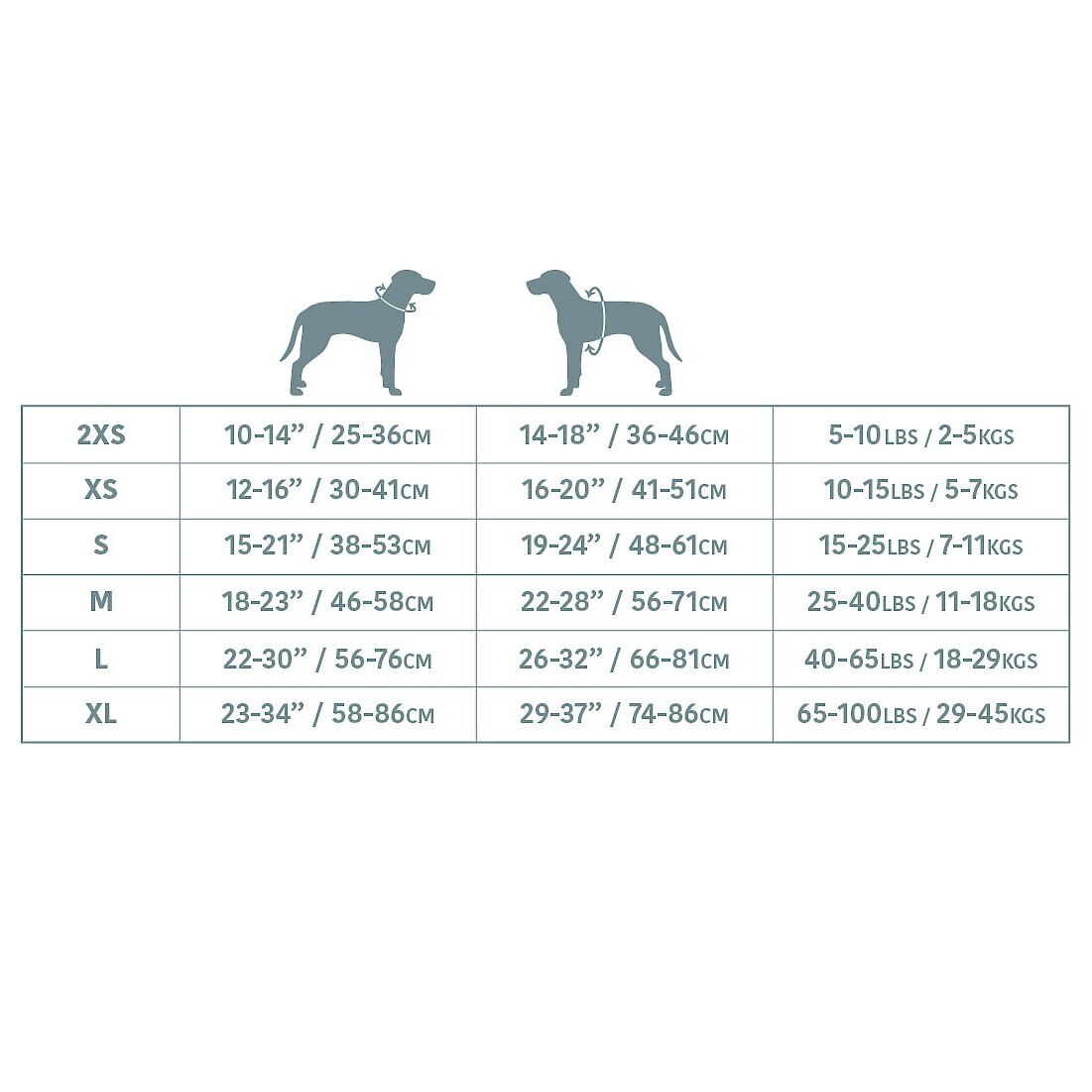 2XS NECK 10-14" / GIRTH 14-18" XS NECK 12-16" / GIRTH 16-20" S NECK 15-21" / GIRTH 19-24" M NECK 18-23" / GIRTH 22-28" L NECK 22-30" / GIRTH 26-32" XL NECK 23-34" / GIRTH 29-37"