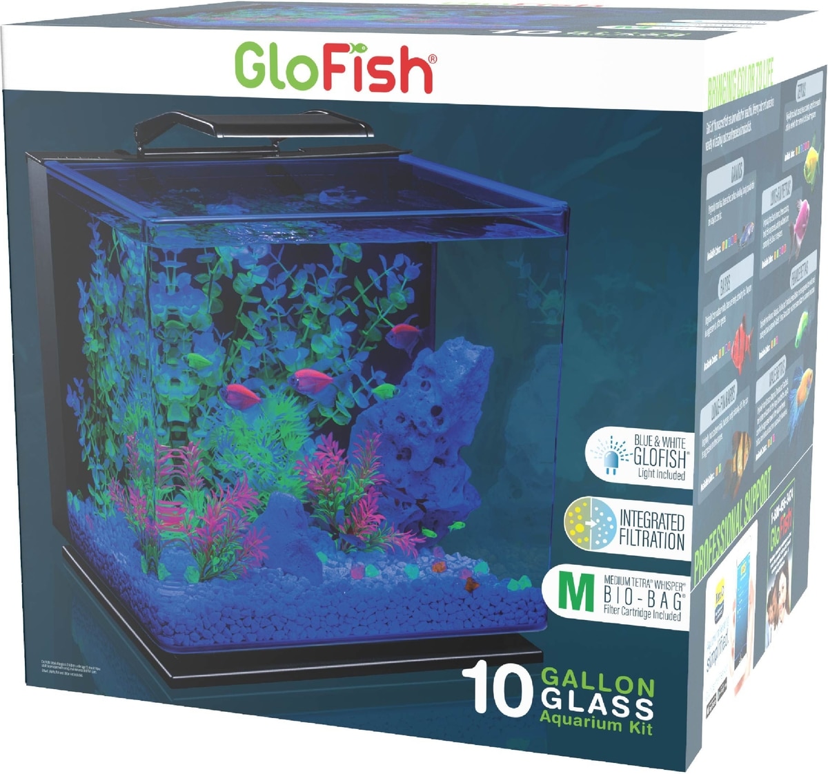 - Each kit includes a 10-gallon aquarium tank with glass canopy, a 55 gallons-per-hour flow rate filter with medium Tetra Whisper Bio-Bag Cartridge, LED lights plus a three-way light switch.