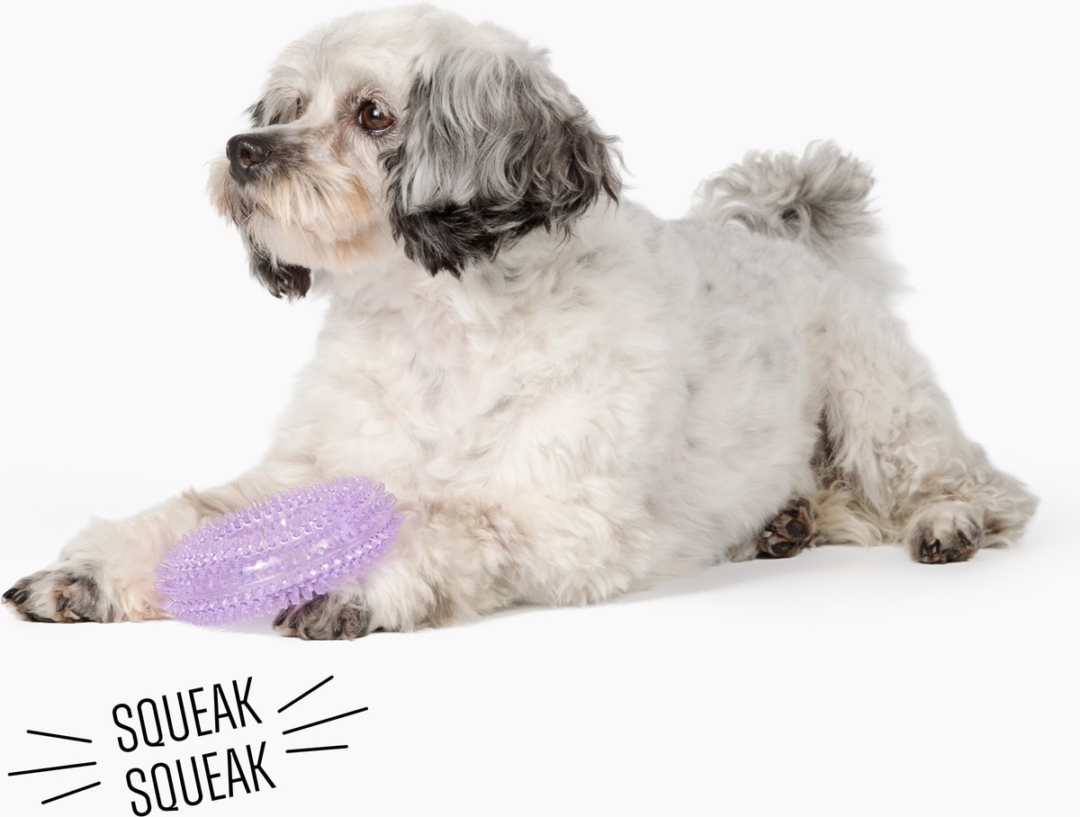 At first, we thought the spiky squeaky ring might be too big for our 6 pound dog, but he is able to grasp it and run with it. These toys are very sturdy and well