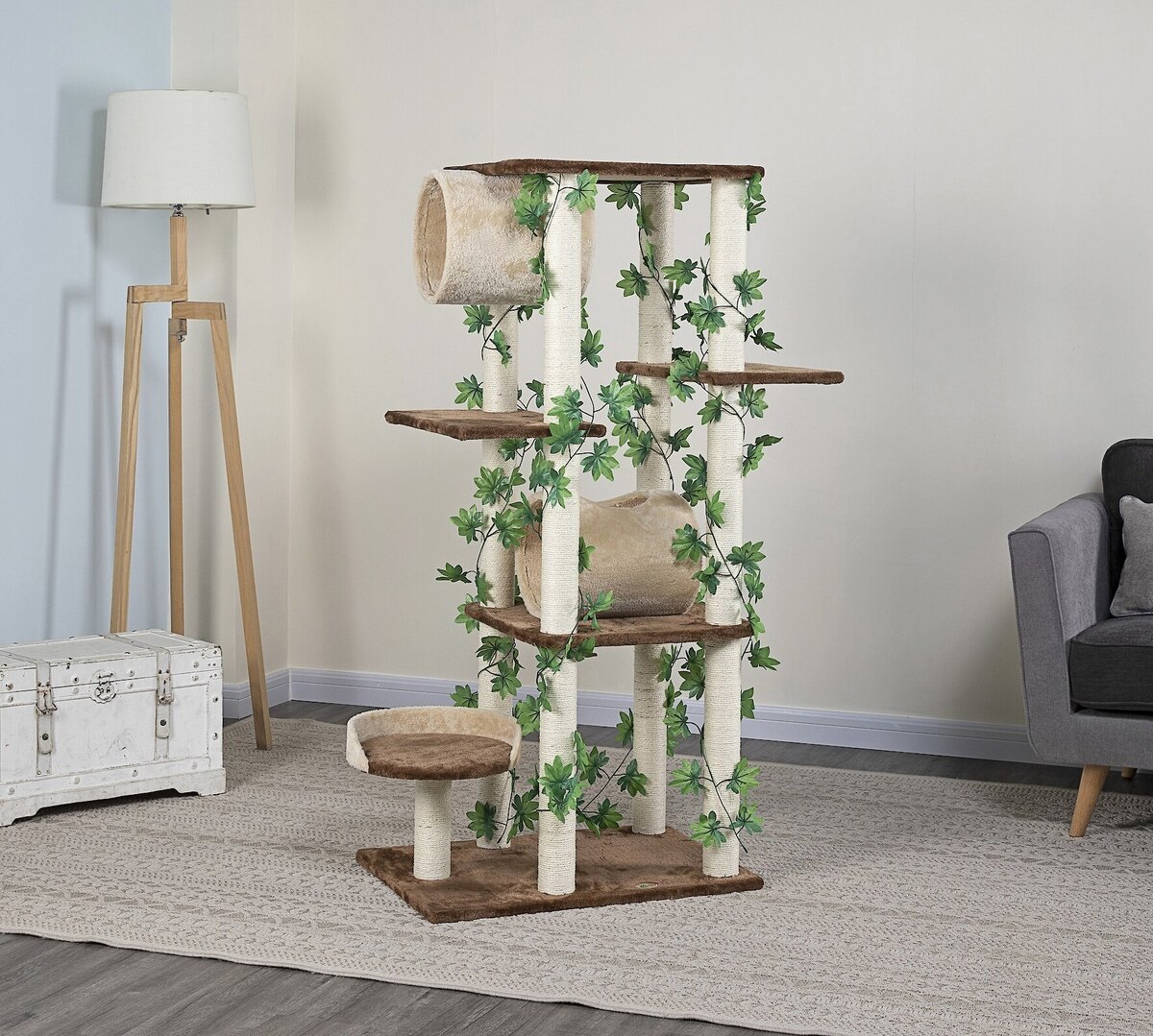 Picture it without the vines because i promise you, they won’t last longer than a week if you have a cat who’s at all interested in them. They fall apart immediately and the plastic breaks apart into small swallowable pieces. The tower itself is wobblier than i would like, considering I’ve owned it for less than three days. The tunnels would be a good feature, except they’re thin and weak. They start to bend with even a bit of pressure, so I don’t have much hope for them lasting long. The shape itself is awkward as well, since the platforms stick out too far to fit naturally in a corner space. The side perch doesn’t help with that, making it even longer for very little benefit, since it’s not tall or big enough to be of much interest to any of my cats. It just needlessly takes up space. I do like the wide top with lots of space and that the sisal covers the entire posts. Buy frisco brand, like I should have done, since I have absolutely no issues with my frisco tower.